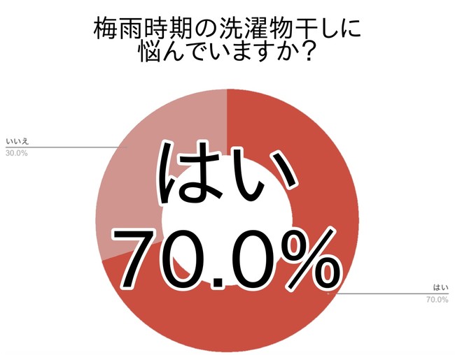 今回の調査では、梅雨時期の洗濯物干しに悩んでいると答えた方は70.0%という結果になりました。