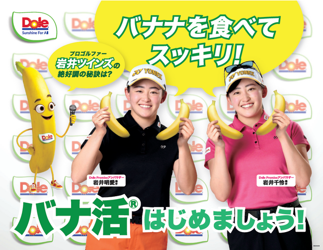 バナナに含まれる「レジスタントスターチ」に腸内環境を整える効果が期待されることから、ラウンド中でもドールのバナナを食べてエネルギーチャージをするという岩井姉妹。そんな岩井姉妹へドールからの応援の想いを込め、岩井姉妹を起用した広告を2023年6月19日~7月2日の期間に、テレビ朝日の某人気番組内で6回、枠外で22回、さらにYoutubeにて配信いたします。