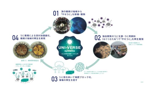 北三陸ファクトリーでは磯焼けによる餌不足で実入りが悪くなった痩せウニを、廃棄ではなく美味しいウニに短期間(2ヶ月間)で変える「ウニ再生養殖」の技術を確立(ウニ用配合飼料及びウニ養殖容器で特許を取得済) 。そして藻場再生の取り組みを行っています。