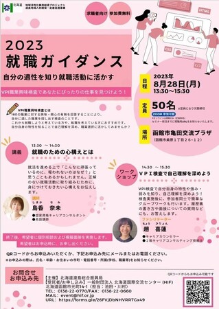 このたび、本事業の一環として、求職者を対象に、自分の適性を知り、就職活動に活かしていただくための就職ガイダンスを対面及びオンラインにより実施します。