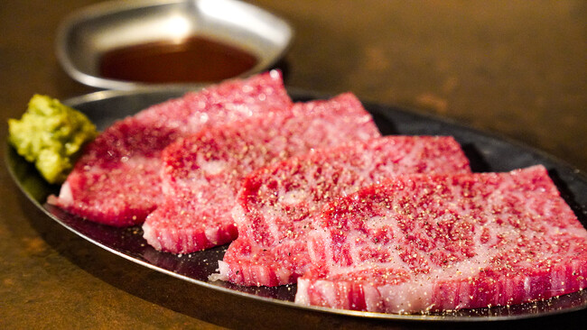 脂がジューシーな部位ですが、旨味もガッツリあり、口の中でとろけながら肉の旨味と脂の甘みを感じられる、ハイスペックな部位です。希少部位「ちからこぶ」と、ぜひご一緒にお召し上がりください。