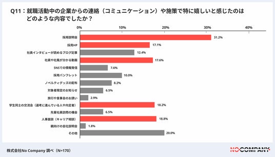 「就職活動中の企業からの連絡(コミュニケーション)や施策で特に嬉しいと感じたのはどのような内容でしたか?」との質問では、「採用説明会」(31.2%)が最も高く、次いで「人事面談(キャリア相談)」(18.8%)、「学生同士の交流会(選考に進んでいる人や内定者)」(18.2%)、「社員や社風が分かる動画」(17.6%)、「採用HP」(17.1%)が同程度に人気が高いことが分かりました。