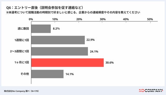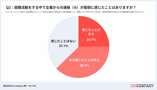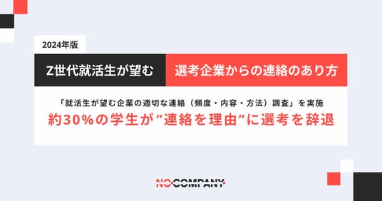 企業の人事部門向けに採用広報(採用マーケティング)支援を行う株式会社No Company(本社:東京都港区、代表取締役:秋山真)は、採用活動の早期化、長期化に伴い重要性が増している採用活動における企業から学生への適切な連絡について、就職活動中に学生が感じた企業からの良い、あるいは悪い連絡頻度、内容、方法を調査で明らかにし、結果を発表致します。