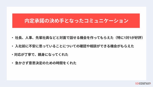 最後に「内定承諾の決め手となった企業からの連絡(コミュニケーション)はどのようなものだったか」を聞きました。代表的な回答は上記の通りです。最終的には実際に代表や人事、社員と直接会い、その人物の対応から会社の社風や人材(自分)の扱い方を確認して安心できたことが承諾の大きな後押しとなっているようです。
