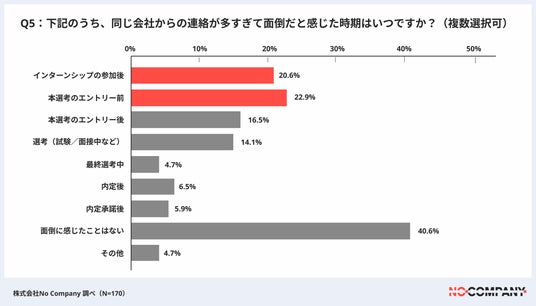 企業からの適切な連絡頻度について聞いたところ、同じ会社からの連絡が多すぎて面倒だと感じた時期は、「本選考のエントリー前」(22.9%)、「インターンシップの参加後」(20.6%)となりました。