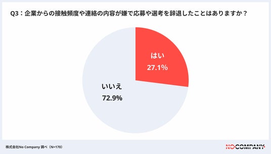 「就職活動をする中で企業からの連絡(※)が面倒に感じたことはありますか?」との質問には、「多少感じたことがある」を含め実に62.9%の学生が「感じたことがある」と回答しました。また、「企業からの接触頻度や連絡の内容が嫌で応募や選考を辞退したことはありますか?」との質問には、27.1%が辞退したことがあると回答しました。