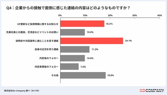 面倒に感じた連絡内容については、「その他」を除いて「説明会や次回選考に進むことを促す連絡」(24.1%)「HP更新など採用情報に関するお知らせ」(18.2%)、「自身の近況を伺う連絡」(11.2%)がトップ3となりました。逆に面倒に感じない連絡内容は「内定承諾後のフォロー」(7.6%)です。