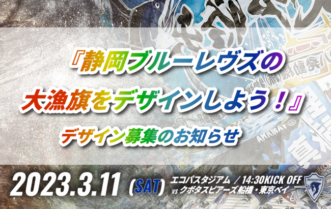 のとおりホストゲームの名物でもある”大漁旗”のデザインを募集することが決定しました。大漁旗はヤマハ発動機ジュビロ時代から続く、ヤマハ発動機社員の皆様の思いから生まれた、静岡ブルーレヴズにとって大切な文化です。この素晴らしい文化に、”静岡ブルーレヴズの”大漁旗として、みなさまからデザインいただいた新たな1本を加えたいと考えています。ぜひご取材いただき、広くお取り扱いいただけますようお願い申し上げます。