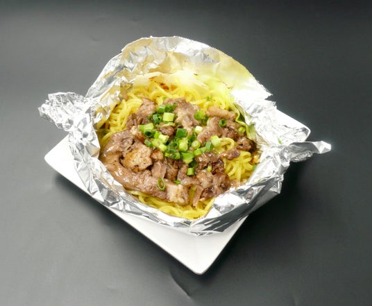 ●釜揚げ牛すじ塩焼きそば:屋台で人気の焼そばを焼肉屋ならではの牛すじと秘伝の塩だれで味付けいたしました。お席のロースターでアルミごと焼いてお召し上がりいただきます。