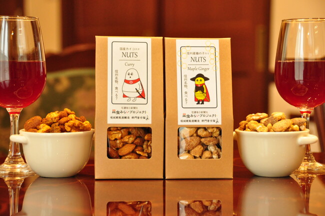 信濃毎日新聞社と「坂城葡萄酒醸造株式会社(長野県坂城町)」が運営するワインとパンの店「粉門屋仔猫(長野市)」の共同開発商品。同店人気商品のミックスナッツをベースに、信州の昆虫食の代表選手ともいえる「蜂の子」と「カイコ」を使い食感と食べやすさを意識してアレンジしています。ワイナリーならではの発想のもと、ワインやシードル等のお酒に合うよう味付けを工夫しており、おやつとしてだけでなくお酒のお供として、また信州ならではのお土産品としても喜ばれます。