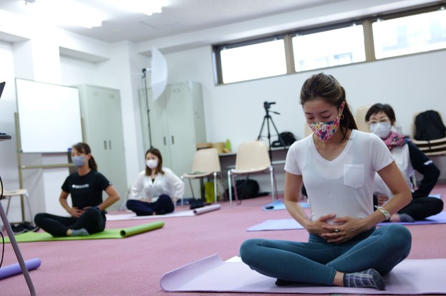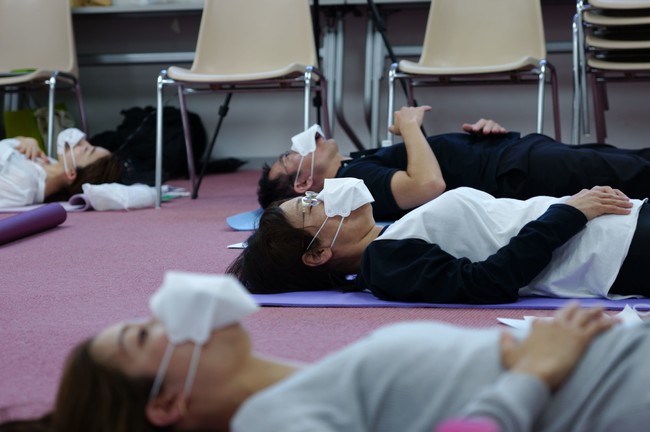 初めは椅子に座りながら講義を受けていましたが、後半はヨガマットの上で座位や仰向けの姿勢で身体を動かしながら呼吸法を習得していきます。