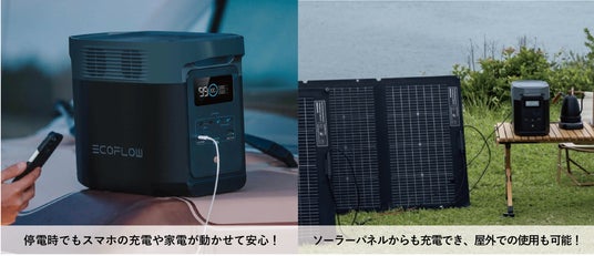 「ポータブル電源」があれば、停電時でも連絡手段や情報取得にかかせないスマホやパソコンを充電できたり、電気ケトルや電子レンジなどの家電を動かすことができます。また、天気の良い日であれば「ソーラーパネル」から充電でき、屋外での使用も可能。普段から万が一に備えながら、防災用や外遊びの電源としても日常的にお使いいただくことができます。