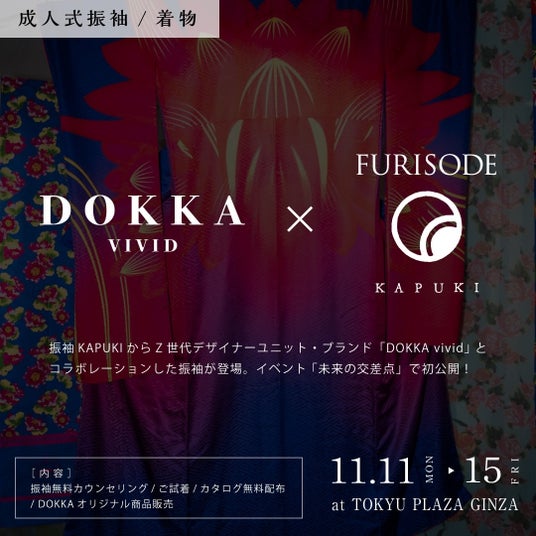 DOKKA vivid × 振袖KAPUKI「DOKKA vivid」と「振袖KAPUKI」の初コラボレーションが、11月11日から15日までの期間、未来の交差点マーケットエリアにて発表されます。デニムやモノトーン振袖など斬新で個性的な振袖を展開する「振袖KAPUKI」とZ世代デザイナーユニット・ブランド「DOKKA vivid 」が初コラボレーション。伝統的な技術を活かしながらも、現代的な感性で再解釈されたコレクションは、従来の振袖の枠を超えた新たな表現を目指しています。Z世代のデザイナーたちによる革新的なデザインが、人生にスパイスを添える鮮やかな色彩で展開され、来場者に独自の文化的体験を提供します。人生のSpiceとなるようなカラフルで刺激のあるデザインを伝統技術で表現した振袖は既存の振袖の枠を超えたコレクションになりました。是非、当イベントにてご覧ください。
