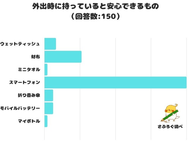 外出時に持っていると安心できるものをアンケートにて調査したところ、1位は「スマートフォン」でした。