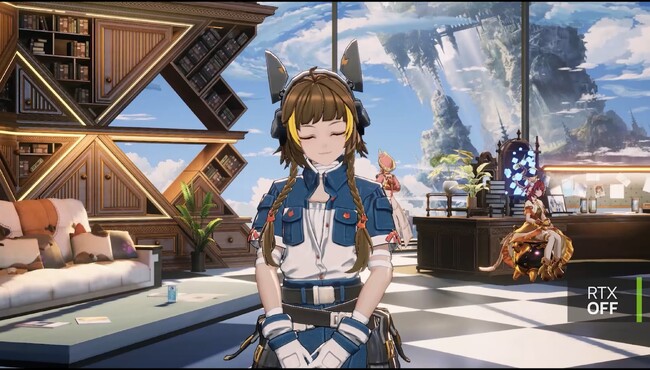 機能が“OFF”のときは平面的だった背景ですが、“ON”にすることで床や家具に光や影が映り込み、空間に奥行きとリアリティが生まれます。この圧倒的な描写力こそが、レイトレーシングの魅力であり、『アッシュエコーズ』独自の美しい世界観をつくりあげています。