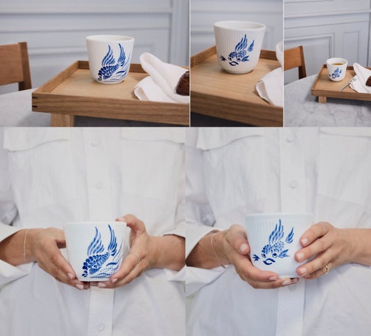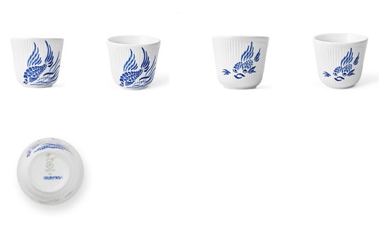 「ロイヤル コペンハーゲンにおける、デンマークが誇るクラフツマンシップと デザインの250周年の祝賀の機会に参画できることを喜ばしく思います。このカップのモチーフは私が何年も前にフランスで描いた魚にインスピレーションを受けたもので、以来ずっとこのモチーフはお気に入りのものです。フルート模様のあるポーセリンの上に、ハンドペイントで描かれた姿が大変愛らしいと思っています。」 と女王陛下は述べています。