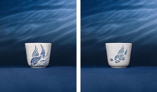 ロイヤル コペンハーゲンの創立250周年を記念して、デンマークのマルグレーテ女王陛下が特別な限定版アニバーサリーマグの挿絵を描きました。 柔らかなブルーの筆使いでハンドペイントされた2匹の愛らしい魚が、白磁 のスタイルカップのフルート文様の溝のある水面をいきいきと泳ぐ姿は、ロイヤル コペンハーゲンの歴史と芸術的コラボレーションの素晴らしい伝統に敬意を表しているかのようです。