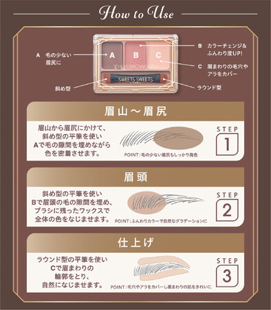 毛の少ない眉尻から眉山は左側の濃い色で描き、毛のある眉頭から眉山にかけては、中央の淡いカラーを使って眉色をカラーチェンジ。