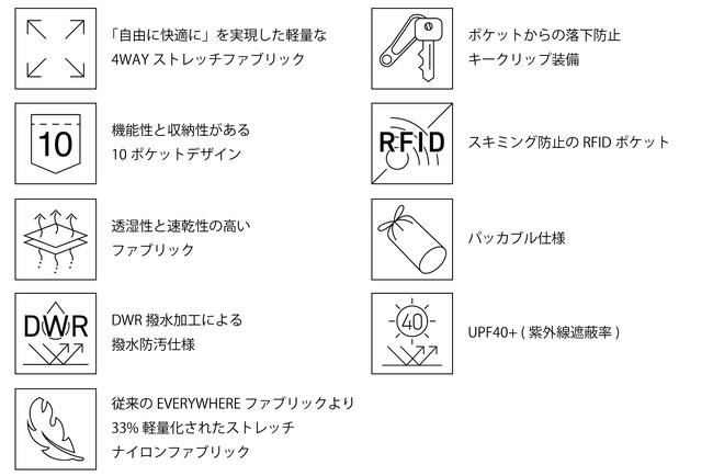 【どこでも快適に】をコンセプトとしたエブリウェアシリーズの多機能ストレッチショートパンツです。肌触りが良いストレッチ性抜群の生地で速乾透湿性が高く、UPF40+で撥水防汚加工されたファブリックはコップからこぼれた水や日常の汚れを付きにくくし、強い紫外線からも保護してくれます。機能性と収納性のある10個のポケットはどれも個性的で落下防止のジッパー付きポケットやスキミング防止のRFIDポケット、その他パッカブル仕様のポケットなど多機能です。