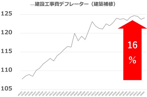 近年続く物価上昇は、修繕費用にも大きな影を落としています。国土交通省が発表している「建設工事費デフレーター」(建築補修)の数値は、過去3年で約16ポイントも上昇しています。