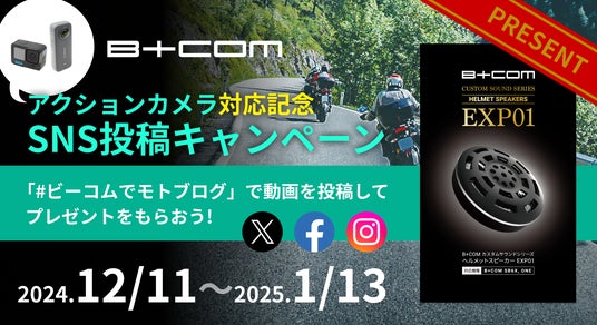 バイク用インカムB+COMシリーズを企画・製造・販売している株式会社サイン・ハウス(本社:神奈川県川崎市/代表取締役社長:新井 敬史)は、B+COMの特定モデル(B+COM SB6XR、B+COM SX1)ご購入者を対象に、「モトブログを楽しもう!キャンペーン」を実施します。期間は、2024年12月11日(水)~2025年1月13日(月)です。