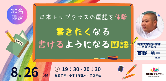 日本中の学校をハッピーにする株式会社NIJIN(本社:東京都江東区、代表取締役:星野達郎)は、小中学生向けオンラインスクール「NIJINアカデミー」を9月1日に開校いたします。日本トップレベルの現役教師による授業を自宅から受けられる環境をつくることで、学校が合わず、学びたくても学ぶ機会を失っている子どもに「学ぶ楽しさ」を提供します。開校に向け、体験授業を開催いたします。第3弾は、埼玉大学教育学部附属小学校の吉野竜一先生が国語の授業を行います。