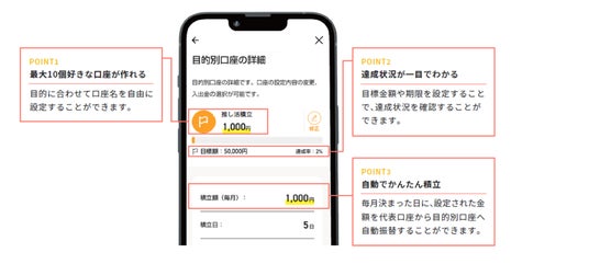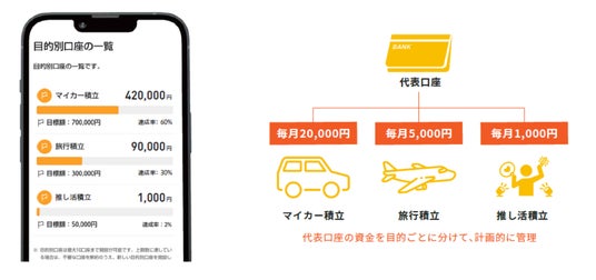 お客さまの目的(旅行、教育、マイカー、推し活など)に合わせ、お金を分けて管理できるサービスです。最大10個の目的別口座が作成でき、口座にはお客さまご自身で「お好きな名前」をつけることが可能となります。