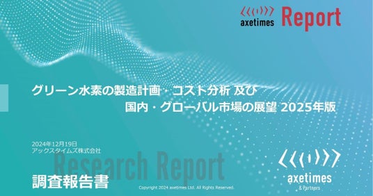 ビジネス解像度を高めるリサーチ情報サービスを展開するアックスタイムズ株式会社(所在地:大阪府大阪市中央区、代表取締役:橋本規宏)は、水素の中でも特にCO2排出量が少ないグリーン水素の市場展望を体系的に分析した調査報告書「グリーン水素の製造計画・コスト分析 及び 国内・グローバル市場の展望 2025年版」を、2024年12月19日にリリースしたことをお知らせします。