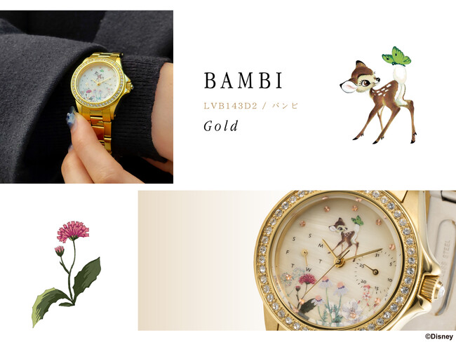 繊細で優しいタッチの草花をあしらった、ボタニカルなバンビの世界。 お花に囲まれた「バンビ」と「とんすけ」がいつまでもあなたのそばに寄り添うデザインウォッチです。