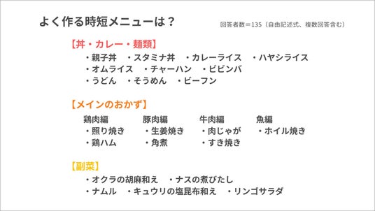 丼・カレー・麺類は、トッピングを変えるなどのアレンジのしやすさと、ワンプレートで済ませられるということから、時短メニューとして人気を集めていることが分かりました。メインのおかず、副菜に関しても、調理家電を活用し、時短に繋げているという声が多くありました。