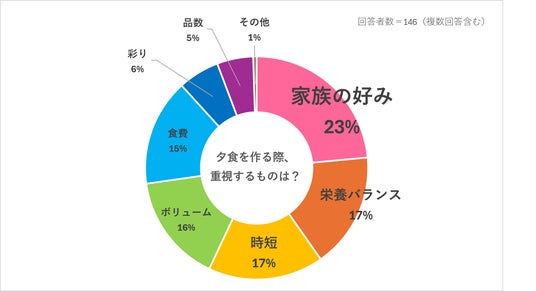「栄養バランス」や「時短」、「ボリューム」、「食費」など、さまざまなことを考えながらも、「家族の好み」を重視する回答が最も多かったです。