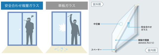 ガラスと中間膜が加熱圧縮されているので破壊されにくく、防犯性能に優れています。万が一ガラスが割れた場合でも破片が飛散しにくいため、安全面もサポートします。(下記参照)