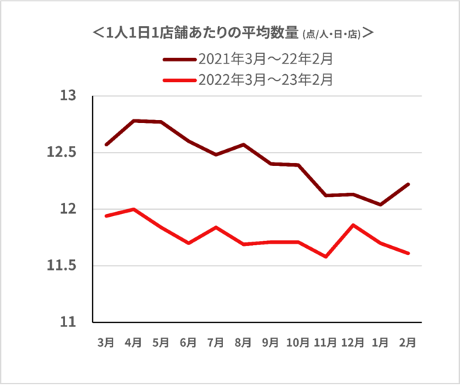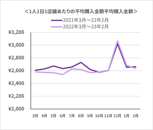 2023年2月の平均購入金額は、前年同月比で約1.0%(-27円)減少 しており、2022年9月以来の前年同月比マイナスとなりました。これは平均単価が約4.2%(約+9.1円)上昇 したのに対し、平均購入数量は約5.0%(約-0.61点)減少 したことが要因となっており、単価上昇の影響による平均購入数量の落ち込みが顕著です。(下記グラフ参照)