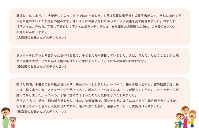 このプロジェクトを経て、おすそわけを受けとったご家庭からは以下のような喜びの声が多数届きました。