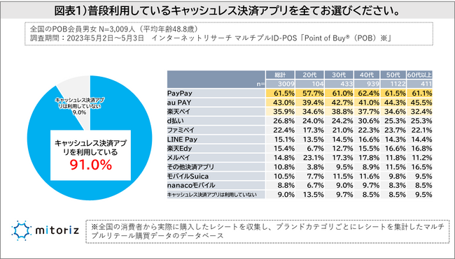 株式会社mitoriz(本社:東京都港区、代表取締役社長:木名瀬博)は、消費者購買行動データサービス「Point of Buy(R)(以下、POB)」の会員3,009人に「キャッシュレス決済アプリに関する調査」を実施致しました。