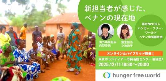 HFWはじめての取り組みとなる、オンラインとリアル会場(東京・飯田橋)のハイブリッド開催での出張報告。現地の写真や動画も交えて、ベナンと自立へ向けて奮闘する住民たちの地域づくりの様子を通して、飢餓問題について考えてみませんか?