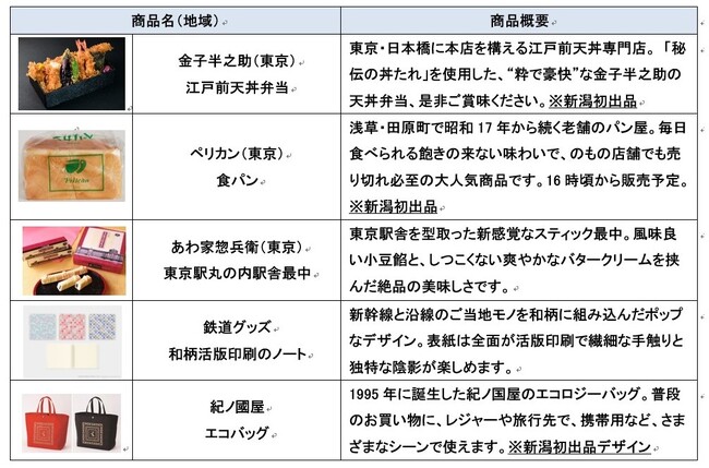 このトライアルにあわせ、9月1日に東京・上野・秋葉原駅で展開している地産品ショップ「のもの」で販売している東京をはじめとした首都圏エリアのおすすめ商品や鉄道グッズ等を、新潟駅の「駅たびコンシェルジュ新潟」において特別販売する「東京のものマルシェin新潟」を開催します!新潟駅で初めて販売する金子半之助の江戸前天丼弁当等の各種お弁当、浅草・田原町で大人気のペリカンの食パン、紀ノ国屋のエコバッグやアップルパイ等、ここでしか入手できない商品を取り揃えます。