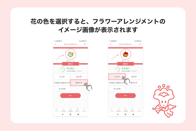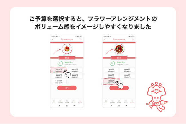 Pasta 導入に伴いアプリのアップデートを実施し、お客様から当日配達を注文いただく際に色・価格による違いがイメージしやすくなるよう、お届けされるお花のイメージイラストを表示するようになりました。