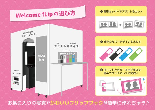 「Welcome fLip」は、16枚の連続写真を“パラパラ漫画”のように楽しめるフリップブックに仕上げる、これまでにない新しい体験を提供する最新機種です。撮影後は写真をカットし、ホチキスで製本して仕上げることで、手作りの楽しさとSNS映えを両立した体験を提供します。