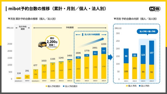 mibotは2024年8月の予約開始以降、順調に予約数を伸ばしており、現在までに累計2,200台超の予約を獲得しています。初期は個人向けを中心に展開していましたが、2025年1月から法人向けの本格展開を開始し、わずか数か月で法人予約は400件超に達するなど、業務用モビリティとしての関心も急速に高まっています。