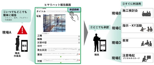SpectA KY-Toolでは、スマートフォンやタブレットからいつでもどこでも簡単にヒヤリハット報告をできるようにしました。ヒヤリハット報告を確認した管理者がデジタル上で承認することで、よりタイムリーで正確な情報共有が可能となります。また蓄積されたヒヤリハット事例は、SpectA KY-Toolがリコメンドするリスク・対策事例としても活用されます。ヒヤリハット報告を上げたユーザーの自現場だけではなく、自社内の他現場に共有することができ、各人の危険体験を共有する基盤となります。