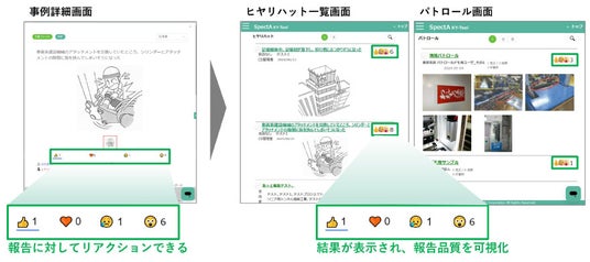 SpectA KY-Toolでは、現場のより自発的なヒヤリハット/パトロール報告を促すために、各ユーザーが報告に対してリアクションできるようにしました。これにより、報告しやすい風土醸成やコミュニケーションの促進、報告者のエンゲージメント向上につながります。また各報告のリアクション数が表示され、報告品質を可視化することで、ユーザーに本質的に役に立つ情報が一目でわかるようになります。
