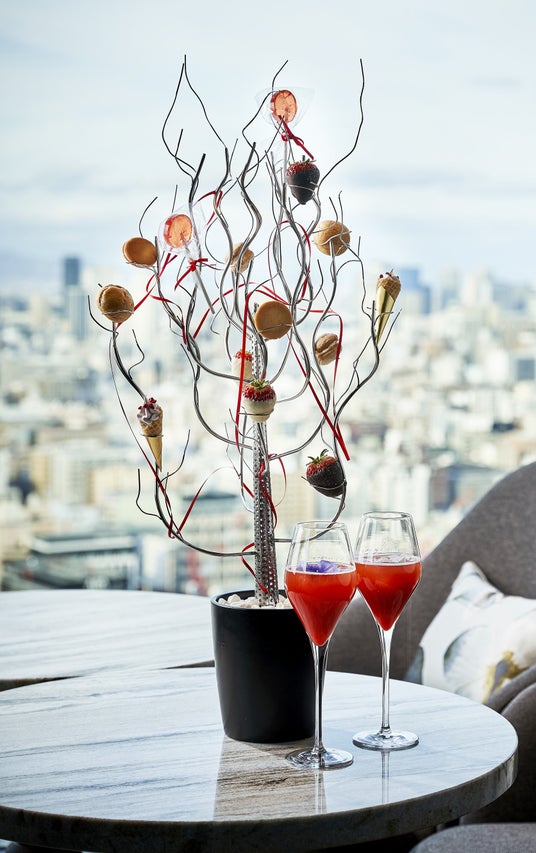 スイーツ狩り気分を味わえると好評を頂いているツリー型スタンドに飾られるのは、6種類の苺スイーツとフォアグラを使用したセイヴォリーです。 フレッシュな甘みが魅力の苺にチョコレートをディップした「チョコレートストロベリ ー」や、さくさくのクッキー生地が自慢の「ストロベリーラングドシャ」など、ティータイムにぴったりなスイーツが並びます。香ばしいチーズがアクセントのシューで濃厚なフォアグラのムースを包んだ「グジュール」もぜひご賞味ください。 大阪市街の絶景を見渡す、落ち着きある空間で“いちご尽くし”のアフタヌーンティーをご堪能ください。