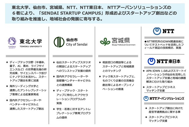この取り組みに本市の「仙台スタートアップスタジオ」等の施策、宮城県が中心として推進する「テック系スタートアップ・サポートコンソーシアム宮城」等によるスタートアップ関係施策並びにNTTグループによるスタートアップビジネスマッチング支援を産学官が連携し一体化させます。
