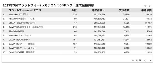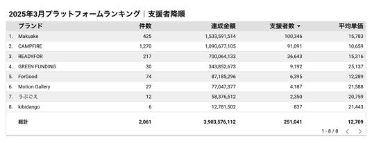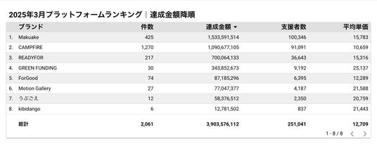 2025年3月に実施されたクラウドファンディングの達成金額ランキングTOP5では、支援額・支援者数・平均単価・達成率の各データが以下のように発表されました。