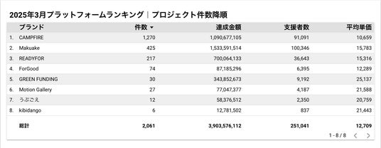 クラウドファンディングに特化したコンサルティング事業を行う株式会社craco(クラコ)は、「2025年3月クラウドファンディング」を発表しました。ランキングは2025年3月1日(土)から2025年3月31日(月)に全8のプラットフォーム(※)で終了したクラウドファンディングプロジェクトを対象としたものです。