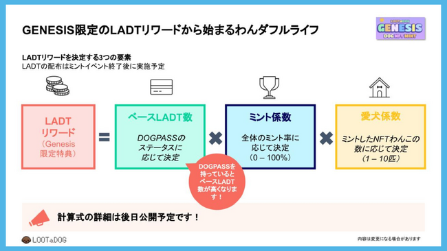 報酬を受け取る為には、DOG NFTを購入いただく必要がございますが、DOGPASSのステータスやDOG NFT全体のミント率に応じて、獲得できるLADT数が変化する仕様となっております。