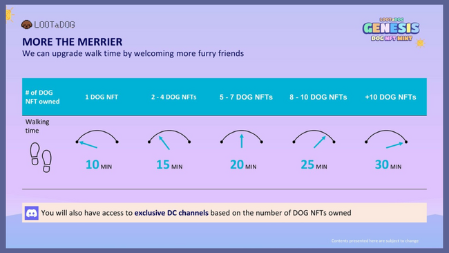 現在のLOOTaDOGでは、一度の散歩可能時間が最大10分程度となっておりますが、DOG NFTの購入数に応じて、散歩可能時間が増加します。