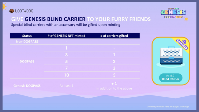 なお、今回のDOG NFTの販売に際し、GENESIS DOG PASSを所有している方には、装備アイテムを100%入手できる『特別なラッキーキャリー』をプレゼントさせていただきます。