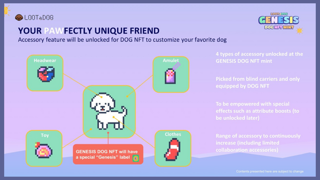 また、DOG NFT販売開始と同時に、アクセサリーによるカスタマイズ機能なども実装予定となっており、より自身の好みに合わせたオリジナルのWeb3わんこを育てることが可能です。